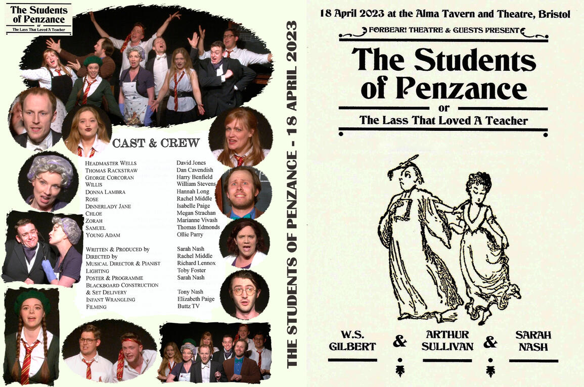 In April 2023, Forbear! appeared for the very first time at the Alma Theatre and Tavern Bristol with The Students of Penzance, a witty Gilbert & Sullivan parody written by Sarah Nash.DVDs of the show are available to buy direct from us by clicking here.Cast: